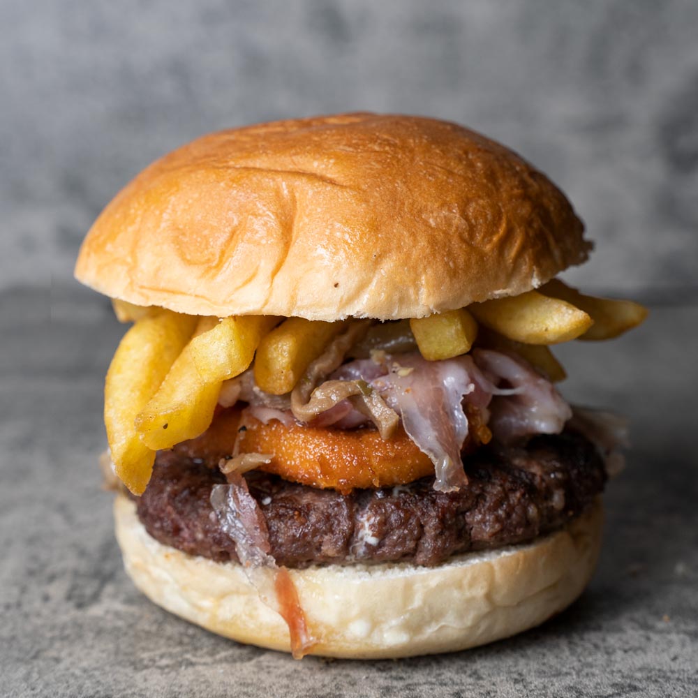 Doppio Hamburger di scottona, Provola, bacon alla piastra, porchetta di Ariccia, cipolla rossa, e melanzane a funghetto