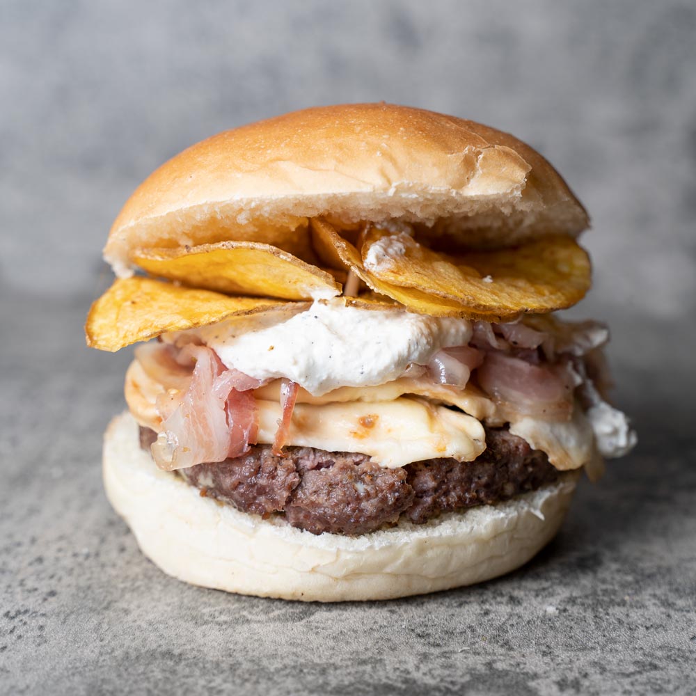 Hamburger di Marchigiana 200 gr. provola affumicata, patatine chips, guanciale alla piastra e crema Grooviana cacio e pepe